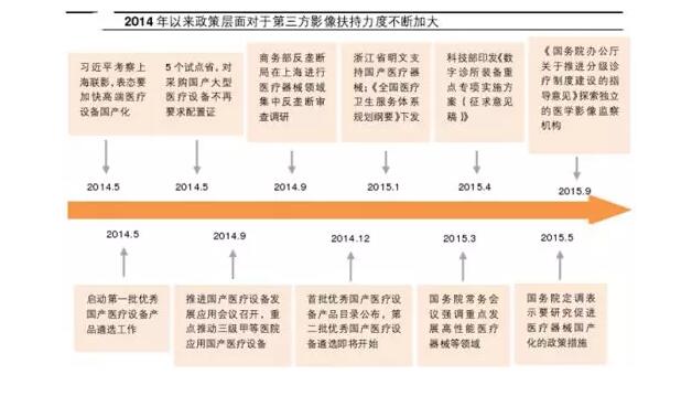 國內(nèi)的醫(yī)學(xué)影像中心復(fù)制了這種模式,但初期受限于人才引進(jìn)難、資金籌集少、隱形歧視和政策限制等原因,彼時(shí)獨(dú)立醫(yī)學(xué)影像中心在國內(nèi)發(fā)展緩慢。2016年8月,衛(wèi)計(jì)委發(fā)布《醫(yī)學(xué)影像診斷中心基本標(biāo)準(zhǔn)和管理規(guī)范(試行)》,首次明確了第三方醫(yī)學(xué)影像診斷中心獨(dú)立法人地位,其后隨著“十三五”醫(yī)改規(guī)劃中“加快社會辦醫(yī)”的內(nèi)容推出和醫(yī)療改革的不斷推進(jìn),行業(yè)終于迎來轉(zhuǎn)機(jī)。