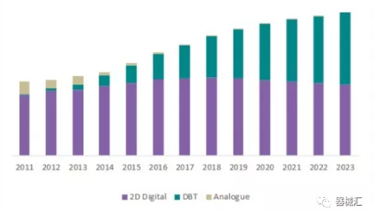 在過去的兩年中,DBT的應(yīng)用使乳腺X線攝影市場經(jīng)歷了快速增長。在早幾年前引入報銷制度后,這一趨勢在美國尤為明顯,2017年達(dá)到頂峰。