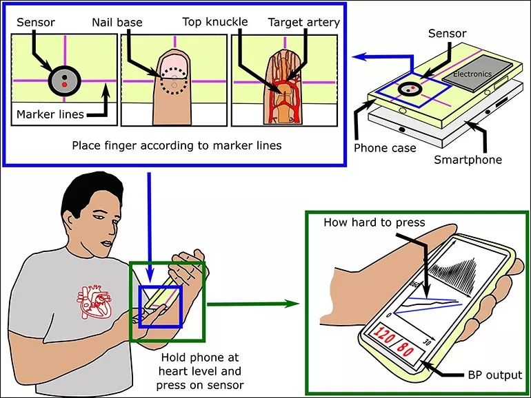 目前這項研究有了新的進(jìn)展,來自密歇根州立大學(xué)和馬里蘭大學(xué)的研究人員發(fā)明了一種可以集成到智能手機(jī)的血壓傳感器,只需按壓指尖即可完成血壓測量。