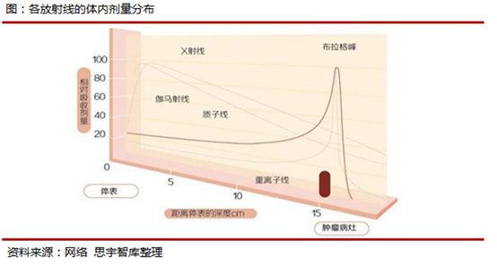 相較傳統(tǒng)的放射方式(γ射線、X射線),質(zhì)子的劑量學(xué)優(yōu)勢(shì)更加明顯,其具備明顯而獨(dú)特的深度劑量特征。其獨(dú)特的布拉格峰可使得質(zhì)子束在射入病灶前不釋放出強(qiáng)大的能量,達(dá)到病灶末端時(shí)能量幾乎剛好釋放完畢,充分保護(hù)了腫瘤病灶前后的正常組織。這種特性使得質(zhì)子重離子相對(duì)其它射線天然地更為適合用于放療。